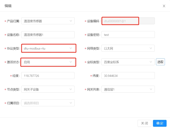 通过dtu接入的设备必填项: